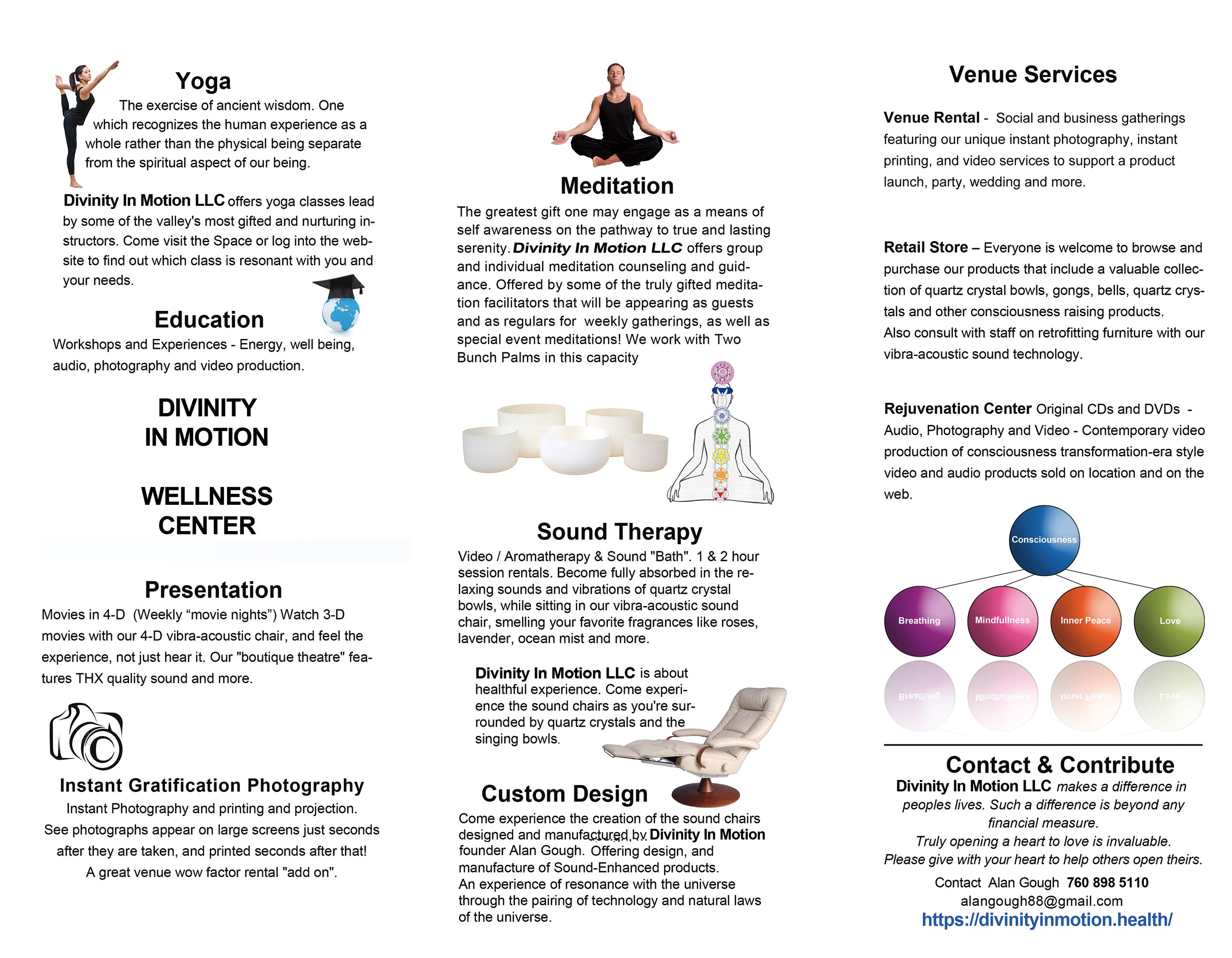 The following brochures represent some of the many aspects of improving your well being through conscious awareness, sound therapy, frequency specific microcurrent, and meditation to name a few.